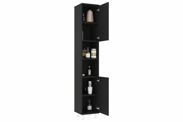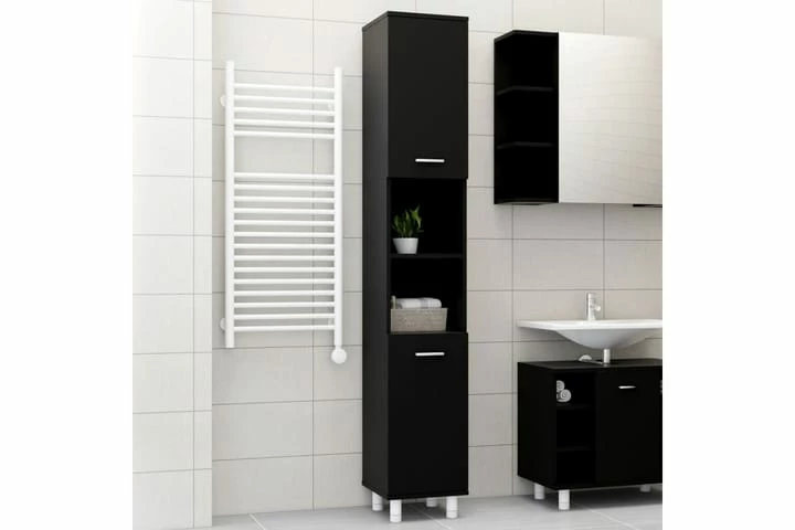 Dette flotte skab er lavet af spånplader, hvilket gør det robust og stabilt. Vaskerumsstativet har 6 rum og 2 låger, hvilket tilbyder forskellige opbevaringsmuligheder og ekstra plads til opbevaring af ting på dit badeværelse. Der er et håndtag på hver låge, så de er nemmere at åbne og lukke. Skabet er nemt at rengøre med en fugtig klud.