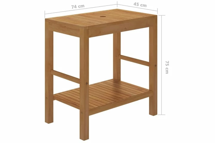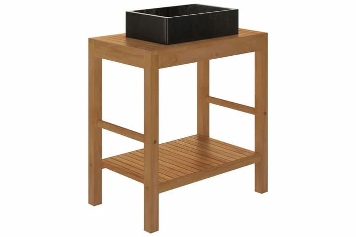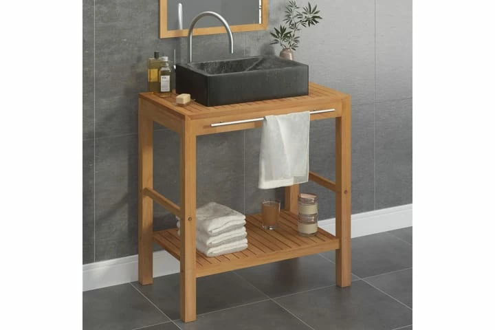 Vaskeskabet er fremstillet af massivt teaktræ, som er holdbart og robust nok til at holde en håndvask i toppen samt andet badeværelsestilbehør. Badeværelsesskabet har en skinne til ophængning af håndklæder eller tøj. Det har også fire ben for at sikre stabilitet og tørhed over gulvet. Den flotte håndvask er brugervenlig til daglig brug, og den vil være en vidunderlig udsmykning i dit hjem. Håndvasken er håndlavet af smukt marmor, så den er yderst robust og har et elegant look. Håndvasken er desuden meget nem at rengøre. Skabet passer perfekt under din vask og gør badeværelsesopbevaring nemt og bekvemt.