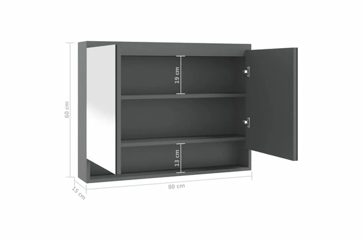 Vægskabet med spejl er lavet af glas og MDF med en melaminoverflade, hvilket gør det holdbart og stabilt. Skabet har to låger og tre rum, hvilket giver nok opbevaringsplads. De kan nemt opbevare dine essentielle toiletsager og badeværelsestilbehør såsom sæber, shampoo, tandpasta mv.