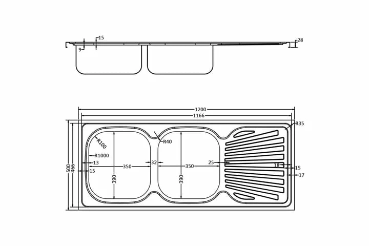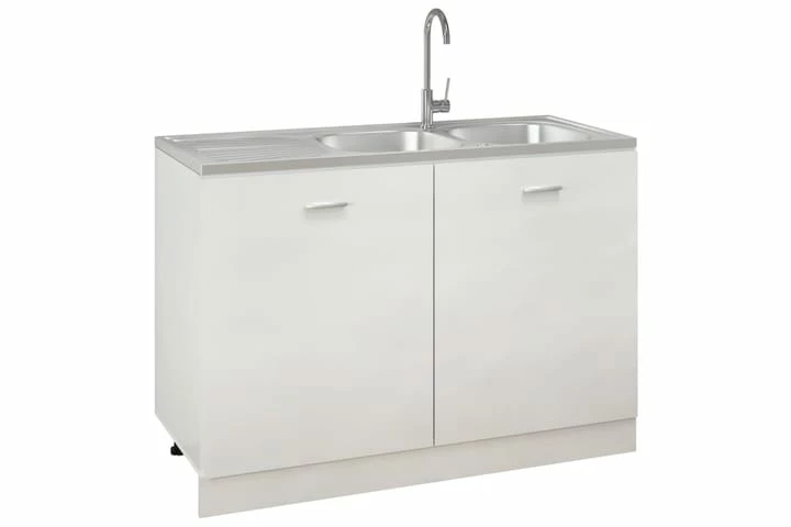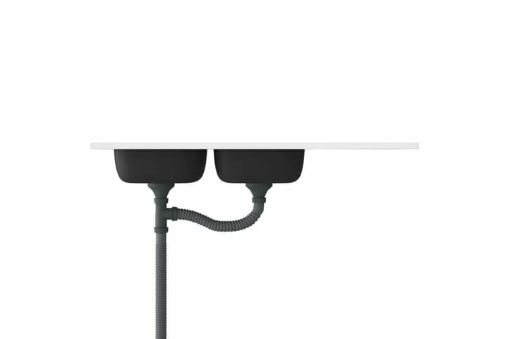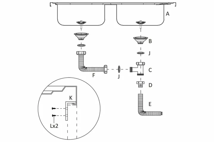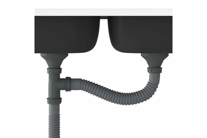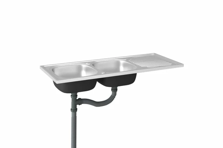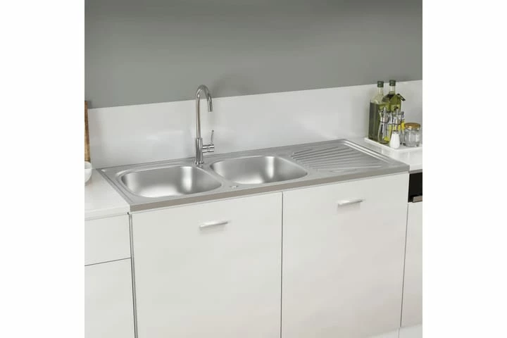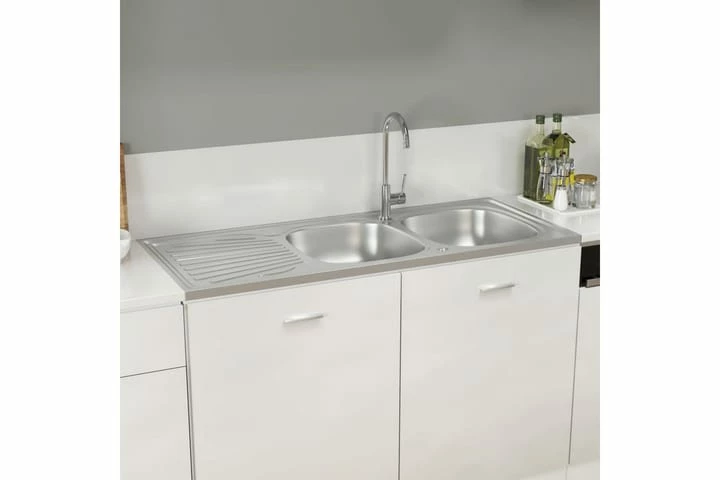 Denne dobbelte køkkenvask med afløbssæt er en tidløs tilføjelse til din køkkenindretning.