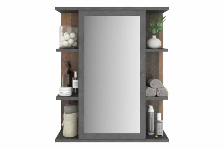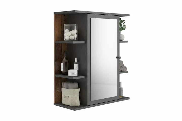 Dette badeværelsesskab med spejl fra FMD i mørkegrå og mørkt træ i gammel stil vil give dit badeværelse et moderne strejf.