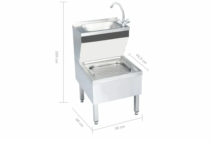 Med design med to vaske kan du vaske hænder i den øverste vask og skylle andet i den nederste vask. Håndvasken er lavet af holdbart, rustfrit stål og kan rengøres hurtigt og nemt. Håndvasken er ideel til catering, kantinekøkkener, værksteder, haveskure og kan også bruges som en udendørsvask.