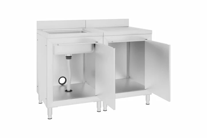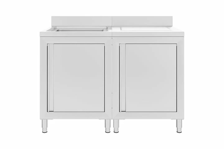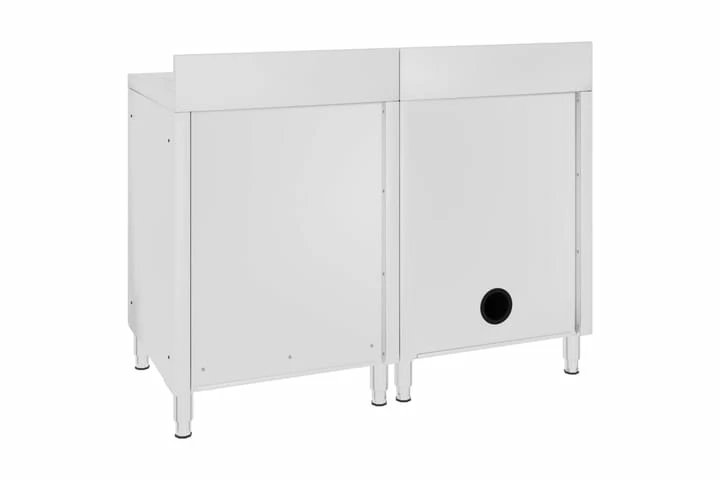 Dette skab er lavet af rustfrit stål af høj kvalitet og er robust, korrosionsbeskyttende og let at rengøre. Bundskabet giver rigelig opbevaringsplads til rengøringsudstyr og tilbehør. På afløbsbakken kan vandet løbe af bestik, tallerkner og gryder, så de ikke efterlader vandpytter på bordpladen. De justerbare fødder holder skabet i niveau på ujævne gulve. Det har også en 10 cm stænkplade og vandrørshul.