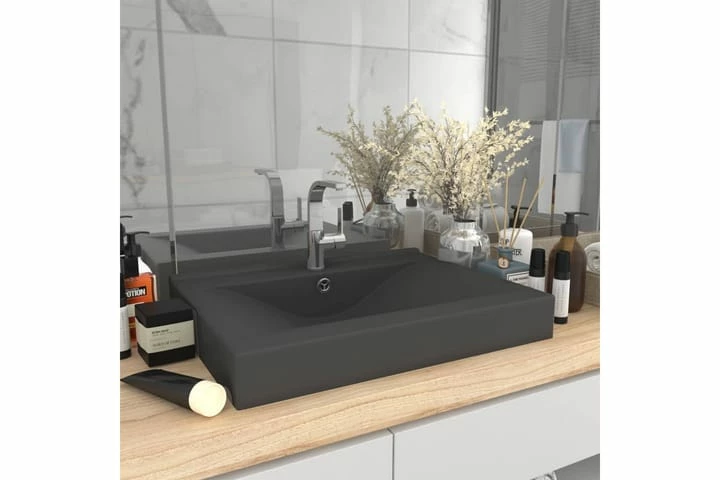 Vores rektangulære håndvask er lavet af keramik i høj kvalitet, og den vil være en stilfuld tilføjelse på ethvert badeværelse eller toilet. Den matte overflade og det luksuriøse design tilføjer et moderne, men elegant design.
