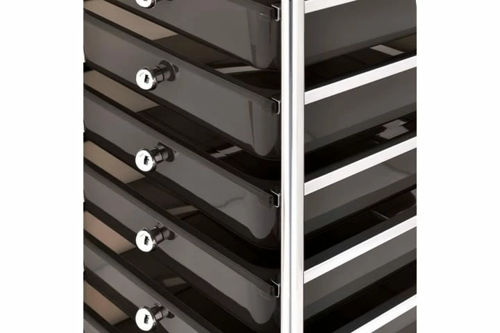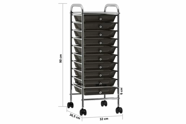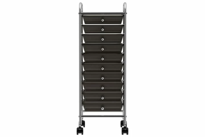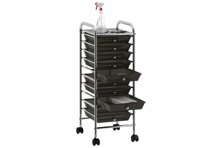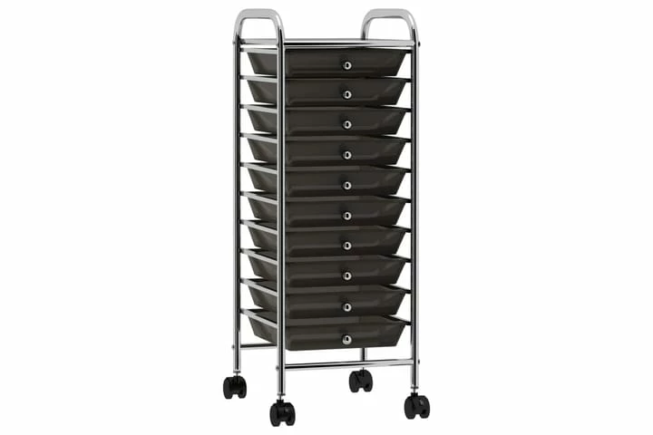 Det forkromede stel giver robust og holdbar vægtunderstöttelse. De 10 aftagelige skuffer giver dig mulighed for at holde dine genstande sammen på tilstrækkeligt med plads. De er lette at fjerne og rengöre. Også de 4 drejelige hjul hjælper til nem transport og opbevaring.