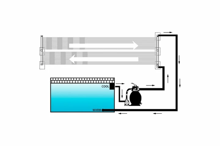 Når dette varmepanel installeres, cirkulerer poolvandet gennem soldrevne kanaler, og det er varmt, når det vender tilbage til poolen. Det er kompatibelt med de fleste poolpumper. Det kan monteres på et tag/stativ eller blot lægges på jorden ved poolen.